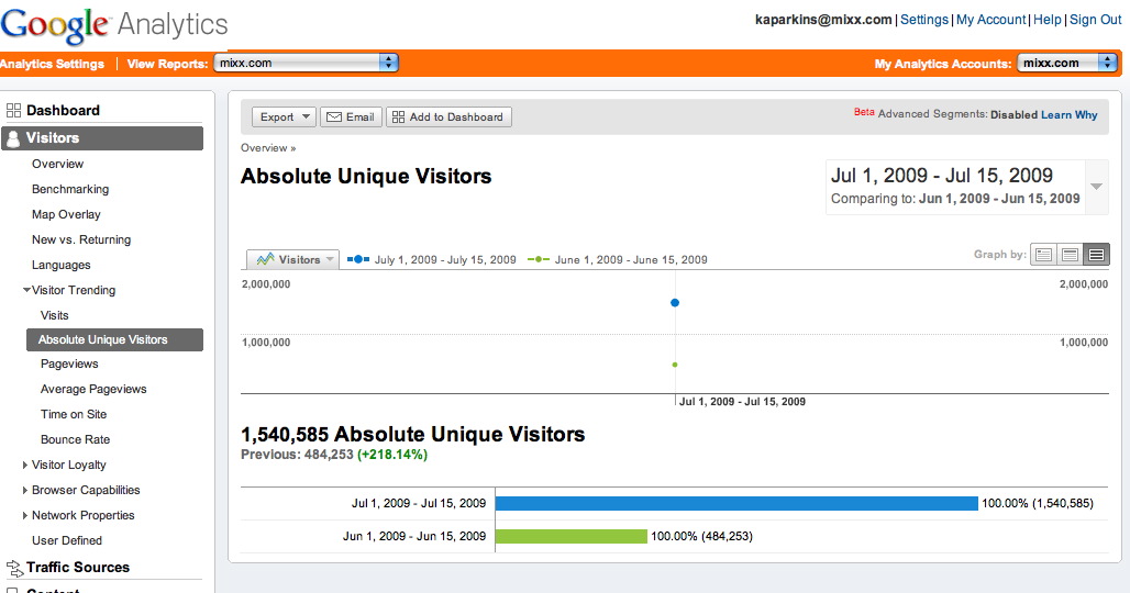 So what happened? McGill admits, “We had some performance problems in the month of June.” A database problem and a DNS change ended up temporarily blocking Google. Traffic was only down 30 percent, says McGill, and has almost fully recovered in June. He sent me a screen grab from Google Analytics (below) showing that in the first half of July, unique visitors tripled to 1.5 million compared to the first half of June. For the full month of June, he sent me a Google Analytics page showing 1.8 million total visitors. (comScore’s estimate for U.S.-only unique visitors in June was 337,000, but it typically under-reports traffic for small sites).