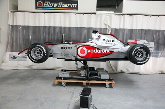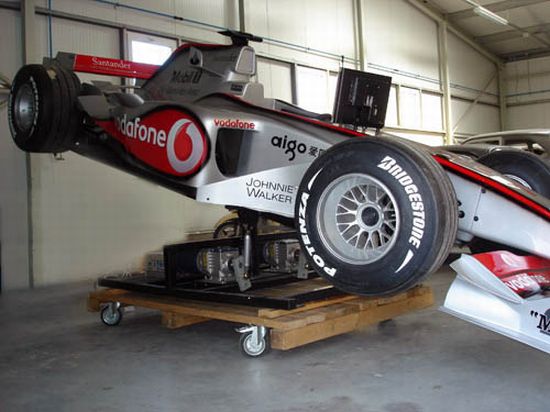 On one hand, it’s a fraking F1 car mounted on top of a motion simulating gizmo. You turn left in the game, the car shifts left. How cool is that? Plus, it’s a Vodafone-sponsored car so you can be just like Lewis Hamilton.