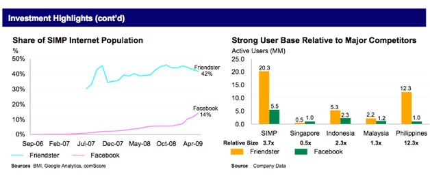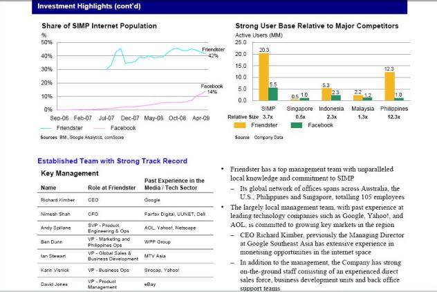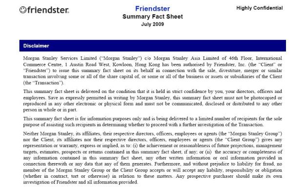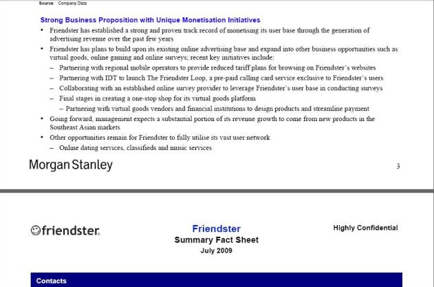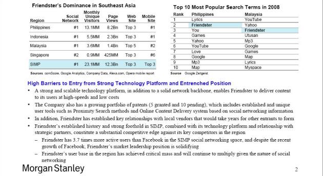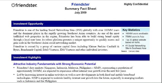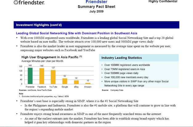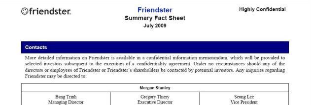 The fact sheet that we obtained shows that Friendster/Morgan Stanley are gunning for a buyer who wants to gain quick access to the Asian social networking scene, emphasizing it would be hard for newcomers to establish themselves given the relationships with local vendors and partners that are needed for such a venture to become a success. Additionally, it touts Friendster’s portfolio of patents in the space (5 granted and 10 pending) and its experienced management team.