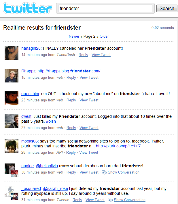 Also amusing was that a quick search on Twitter turned up mostly messages from US-based users that were deleting their Friendster accounts.