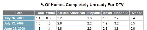 Good job, everyone! The DTV switch seemed to went well. The June 12 transition came and past on our end with little fanfare. Hopefully it was the same with you. Nielsen is reporting that the vast majority of US homes – 98.9% that is – can receive DTV signals. Kind of surprisingly though is that the under 35 demo is the least prepared with 2.7% unable to receive the digital broadcasts.