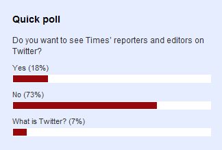 The homepage features a quick poll asking members if they want to see Times’ reporters and editors on Twitter or not. I guess this is the most pressing issue the New York Times wants to hear from its readers about.