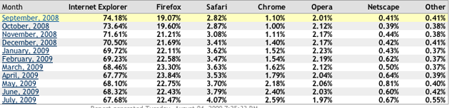 Net Applications has just released its latest report on browser usage, covering the months of June and July. The results show the impact of the launch of Firefox 3.5 on the browser market, as well as the steady decline of Internet Explorer 6 and 7 as they give way to IE8 and other browsers.