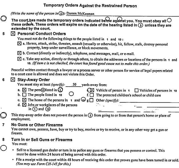 McKeeman is prohibited from contacting Pincus at all, and must stay at least 50 yards away from him. He is also explicitly prohibited from any of the following to Pincus: “harass, attack, strike, threaten, assault (sexually or otherwise), hit, follow, stalk, destroy personal property, keep under surveillance or block movements.” He is also restricted from purchasing guns or other firearms, and must sell or turn in any guns that he owns.