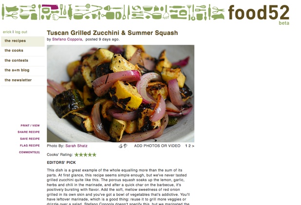The site itself is designed less to be a comprehensive cooking site than a highly curated one. In addition to the contests, there are editors’ picks. You can browse by recipes (organized both by category and most recent) or by cooks (contest winners, most active, and “cooks we admire”). Of course, there is also a blog on the site written by Hesser and Stubbs, although that is not front and center and the first entry is about the shoes they wear while cooking. Not terribly appetizing.
