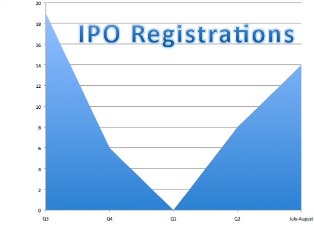 Another small sign that the worst of the recession may be behind us: IPO registrations are clawing their way back from the shadow of the valley of death (also known as the first quarter if 2009, when there were zero IPOs registered with the SEC). So far in July and August alone there have been 14 IPOs, as many as in the previous three quarters combined. These numbers and the chart above are based on the number of IPO filings tracked by Hoovers as of yesterday. Renaissance Capital counts 16 IPO registrations in July and August, and if you look on the SEC’s Edgar site it looks like a few more filed today.