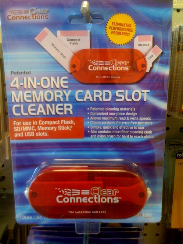 And if the Flash Drive Lock isn’t enough “WTF?!” for you this morning, consider the Memory Card Slot Cleaner that I spied at MicroCenter yesterday! It’s a $2 piece of plastic that you use to clean the various media slots on your devices. It cleans Comfact Flast, SD/MMC, Memory Stick, and USB slots to allow “maximum read and write speeds!”