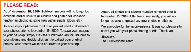 Canadian photo sharing startup BubbleShare will be shuttered on November 15, 2009. Users were notified via email and a notice on the site’s home page.