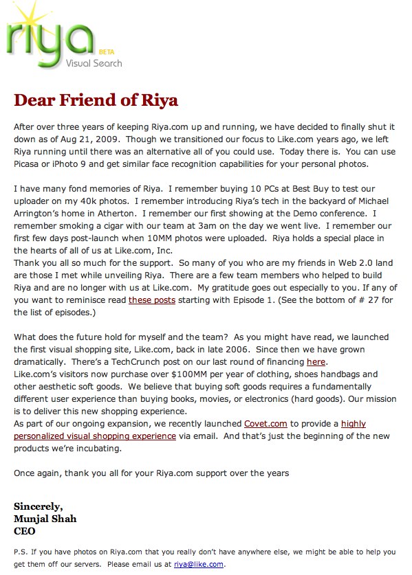 Facial recognition service Riya will shut down on August 21, 2009, says founder Munjal Shah in an email to users this morning. We are adding it to the TechCrunch DeadPool.
