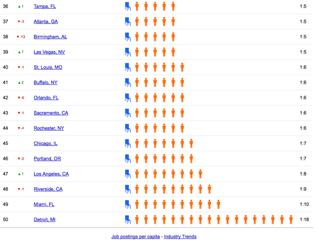 The index ranks cities based on how many unemployed people there are compared to job listings. For every one unemployed person in Washington, D.C., for example, there are six job postings. Whereas in Detroit, there is only one job posting for every 18 unemployed people. The higher the ratio of job postings to unemployed, the more chances there are of landing a job.