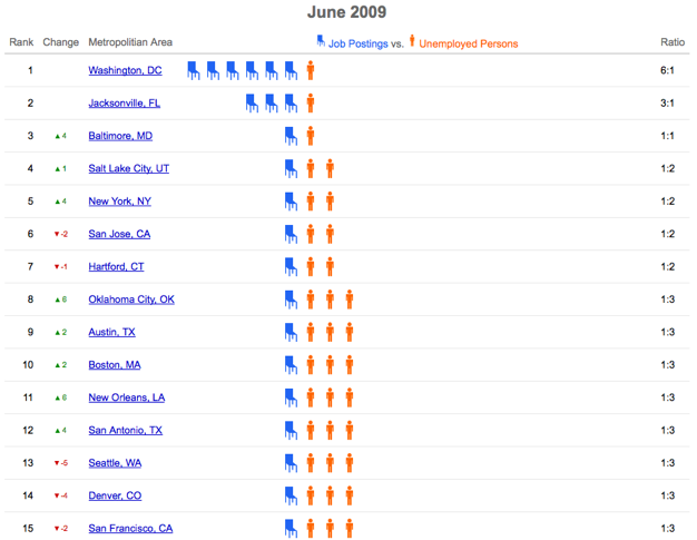 The top ten cities in the index for finding jobs (and their corresponding ratios of job postings to unemployed) are: