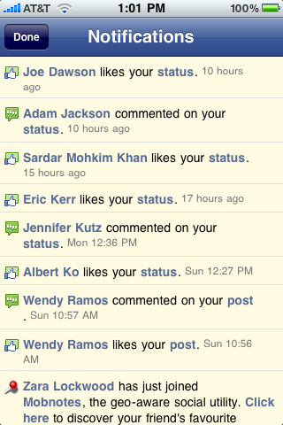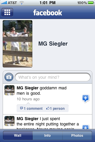 The bigger omission, as I see it, is the lack of a robust search tool. Facebook recently rolled out the upgraded search functionality on its site, but on the iPhone searching is limited to profiles and pages. Basically, it’s useless, as you can get much of this information from the Friends area. If Facebook is serious about search, it needs to make basically everything that gets updated on the site (allowed for by individual’s privacy settings, of course) searchable on its mobile app in real-time. That would be a killer feature.