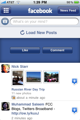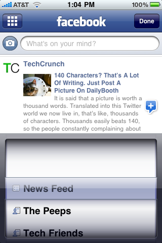 The main screen that you were probably used to from the old app now resides in the upper left corner of the main screen, as the “News Feed.” It largely looks the same but the ability to “like” items has been added to the ability to comment on them. You can also now easily take and post videos if you have an iPhone 3GS. Hitting the “News Feed” button in the upper right hand corner, allows you to sort this feed by the various filters you’ve set up.