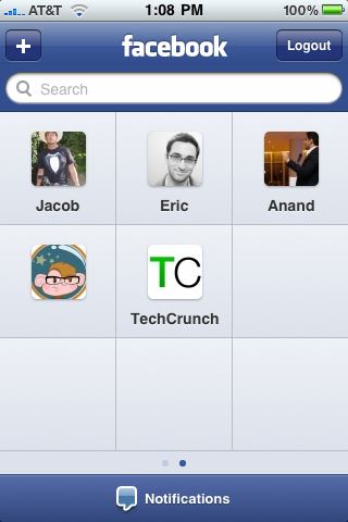 Nowhere is this new look more evident than on the new Facebook home screen. It’s sort of like the iPhone main screen, but with a different, distinctive design. The large buttons are easy to hit, and best of all, you can add people’s profiles and pages as icons as well, to provide shortcuts to your favorites.