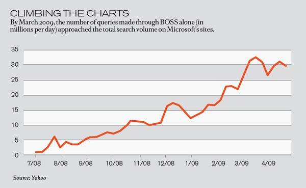 By last May, Yahoo BOSS was serving up 30 million search queries a day. You can see the rapid growth in search volume in the chart above, which comes from a Technology Review profile of Vik Singh, the 24-year-old engineer who was one of the main champions behind Yahoo BOSS. (He is one of Technology Review’s 2009 Innovators Under 35)
