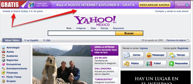 Update: Poor Yahoo Mexico doesn’t know what to do, so they promote both browsers in the header.