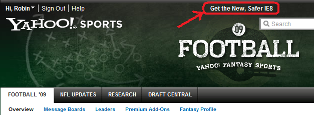 Not sure when this started occurring exactly, but Yahoo is apparently now letting Firefox users know that they’d be better off switching to the “new, safer Internet Explorer 8”. Apart from this tweet sent out yesterday, we haven’t noticed anyone noticing, so we suspect it’s fresh and a direct result of the recent Yahoo and Microsoft love-fest.