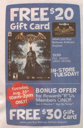 According to a Toys R Us snippet sent in to Shack, for a limited time tomorrow morning, the giant toy retailer will be offering Rewards R Us members with a $30 gift card when purchasing Batman: Arkham Asylum. If you can’t make it down to your local TRU store tomorrow between 10AM and 2PM then you’ll just have to deal with the $20 gift card. That’s one hell of a deal for a wicked awesome game.