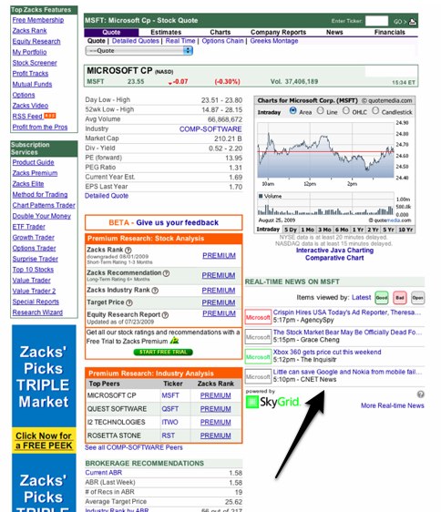 Similar to the deal with StockTwits, SkyGrid will embed a widget into Zacks pages of financial information for companies, showing a stream of incoming, real-time news for the company on the page. You can also filter news by sentiment: SkyGrid uses semantic text analysis to determine if each incoming article is deemed positive, negative, or neutral about a given company.