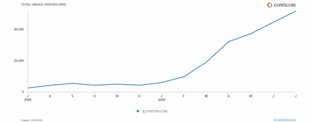 Which is why it may be unsurprising that Twitter passed a fairly big milestone sometime in July: Twitter passed 50 million unique visitors worldwide, according to comScore, reaching 51.6 million unique visits worldwide at the end of the month. Twitter added 7.1 unique visitors from June to July. Growth dipped slightly, with visits increasing by 16 percent from June. Twitter’s visits grew 19 percent from May to June, and saw 16 percent growth from April to May. But Twitter’s highest rate of worldwide growth may have been in the month of March, when the site grew by 95 percent, from 9.8 million to 19.1 million visits, according to comScore. June’s number may have been buoyed by the Iran election protests.