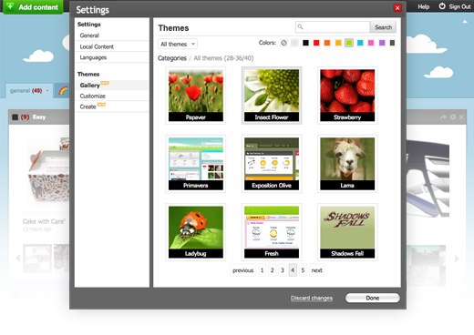The layout of the editing tool is fairly simple. Users “click and pick” on the page:, meaning they click which part they want to edit and pick options from a color palette and design option menus. NetVibes offers a directory of themes or you can create your own theme. You can also publish your theme to the gallery for other NetVibes members to use. Every change is shown live in a preview pane, making it easy to see how a particular design will look. Plus, users can add widgets, feeds, social networks and more to their pages. The bonus: it’s all free.