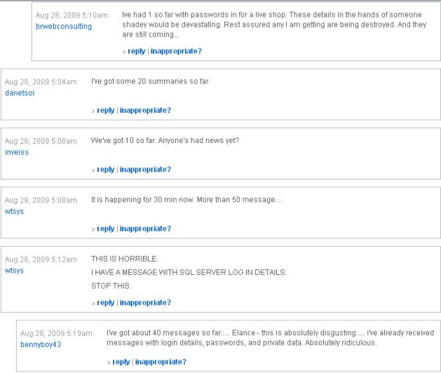 Second time this Summer we write about Elance, a service that allows for companies and individuals to hire and pay independent professionals and contractors online, and once again it’s not good news but another security issue. A registered user of the service, Salma Jafri, tells us she has been receiving dozens of private messages that were erroneously sent to her account, on occasion even containing confidential information and sensitive data such as login details for Elance accounts and third-party servers.