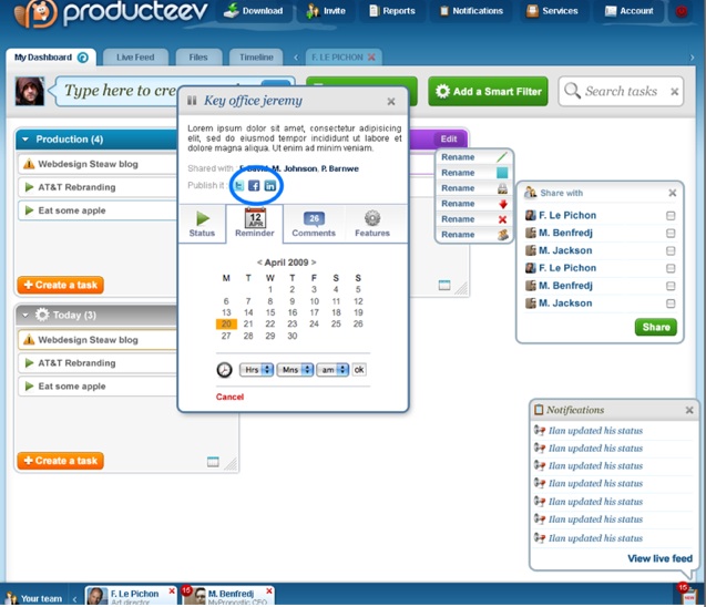 Producteev shows you a dashboard of different tasks you’ve set up, each in its own widget box which you can drag around and rearrange. For its commercial launch today, Producteev is introducing some new features. One is the ability to syndicate any task to Twitter or Facebook.
