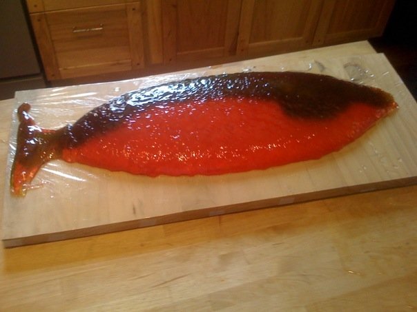 I thought you’d appreciate these pics of a 6lb Swedish Fish that I made about a year ago for my sister’s birthday. To make the fish we melted down two 3lb bags of gummi bears, separated by color, then poured them into a fish-shaped serving dish. We poured them in different layers so that we could get the most accurate, life-like red salmon coloration. We then gave the fish that characteristic Swedish Fish coating with some powdered and granulated sugar.