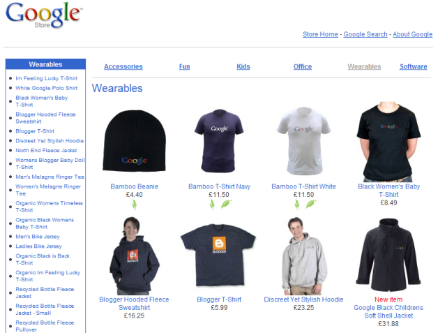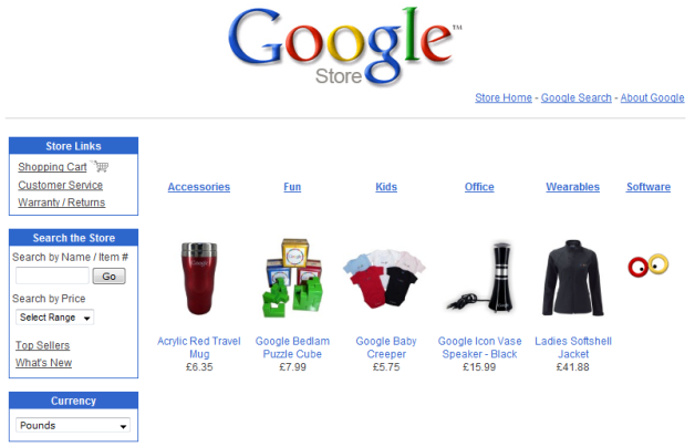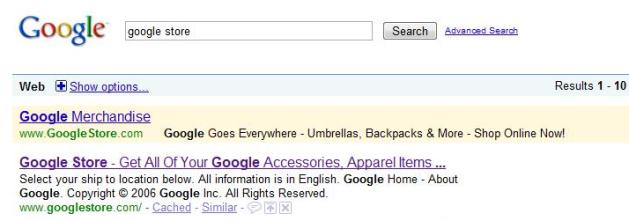 Color me surprised to discover Google operates an online merchandise store aptly named Google Store, courtesy of @newsycombinator. Google-centric blogs like Google Blogoscoped have understandably been aware of this for quite some time, but I had no idea. There’s no mention of it on the Google corporate website (although it’s linked at the bottom here), and even the Wikipedia entry simply redirects to a list of all its products. They’re apparently even running ad units for it on their network (see below).