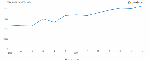 Say what you will about the quality of the reviews on Yelp or the lengths it will go to get verboten features into its iPhone app, it has made the jump from Web 2.0 darling to a mainstream service. Over the past year, Yelp has nearly doubled its U.S. audience, while incumbent CitySearch has remained flat. In July, Yelp had 8.6 million unique U.S. visitors, up 80 percent from a year ago. Citysearch, on the other hand, literally had zero growth, staying at 15.4 million uniques, although it bottomed at 13 million in April and has come back up since then (comScore).