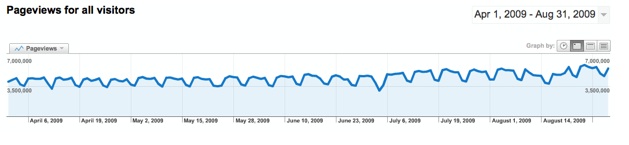 I asked Yelp CEO Jeremy Stoppelman about the pageview situation, and he sent me an internal Google Analytics chart pasted at bottom of this post). “As you can see we’ve continued to grow pageviews smoothly throughout the summer,” he says, “so it looks like the effect Comscore is reporting is spurious.” There is definitely a discrepancy there. Stoppleman also says that worldwide Yelp did 157 million pageviews in August (although he thinks that is becoming a less a meaningful metric as Ajax redesigns reduce the need for page refreshes) and more than 25 million unique visitors. (The comScore numbers cited above are only for the U.S.)