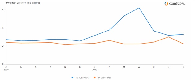 Yelp’s pageviews and average time spent per user on the site are also up 150 percent and 22 percent, respectively. In fact, the 3.3 average minutes per visitor on Yelp is above Citysearch’s 2.3 minute average. But comScore shows a steep drop in both pageviews and average time spent starting in May, with a leveling off in July. Citysearch experienced similar drops. (See charts below). It’s hard to say what is causing these drops. It could be that people are not finding what they are looking for, or the opposite, that they are finding what they need faster due to better site design. I suspect it has something to do with the latter. For instance, a much-improved Citysearch redesign went site-wide in March and Yelp is constantly tweaking its site. Update: Kara Nortman, the executive who runs Citysearch, says that the pageview numbers are down slightly, but not as much as comScore suggests. Part of this has to do with Citysearch actually going through the site and “pulling out pages that are not great consumer experiences,” which hurts SEO, but improves the site overall. Citysearch is also trying to reduce the number of searches it takes ti get to what you want, which also causes pageviews to drop.