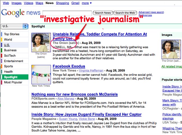 And what’s a good example of a special-interest article with “enduring appeal?” The Onion, a satire website which is currently the top story on Spotlight. This article beats out everything else that old media investigative journalism can muster right now.