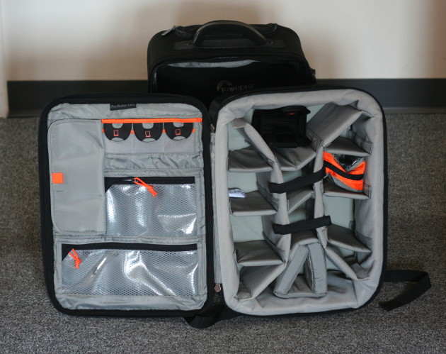 1-2 pro DSLRs with grip plus 6-8 lenses; accessories, up to 17″ notebook; airline carry-on sizePro Roller x100