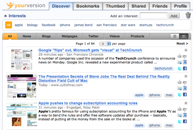 YourVersion launched today, and looks to help users search for content across blogs, multimedia sites, Twitter, and other social sites, updating with relevant content in real-time. Rather than force users to run the same searches multiple times or rely on a clunky bookmark system, YourVersion pays attention to your interests, and presents results accordingly. You can browse through results from all of these content sources, indicating which ones you like (or dislike) using thumbs up or thumbs down functions.