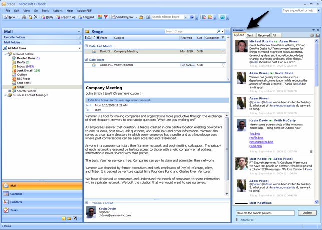 It’s not surprising that Yammer is now integrating with big-time enterprise apps like Outlook. The company has grown incredibly fast in a year, with employees at more than 40,000 companies worldwide using Yammer. Not to mention, Yammer’s product is solid and continues to improve. A few months ago, Yammer released a new, sleeker version of its desktop app (built on Adobe Air). And Microsoft definitely stands to benefit from helping Yammer build innovative applications on top of productivity software or products. Sacks said that Yammer is currently developing a plug-in for Internet Explorer, similar to the plug-in the startup created for Firefox.