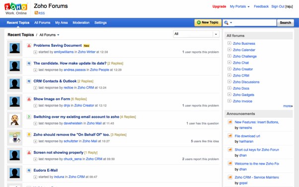 Similar to any forum, Zoho Discussion lets users create threads based on a particular topic. In terms of features, Zoho has focused in creating plenty of social tools to make the discussions more interactive and engaging. For example, users can vote on comments within a forum, indicating whether they “Like” a particular comment or forum. Aside from posting in the forums, users can interact in real-time through the built-in chat feature. Within the forum, users can create a profile, follow other users, bookmark particular threads and send private messages to administrators and users.
