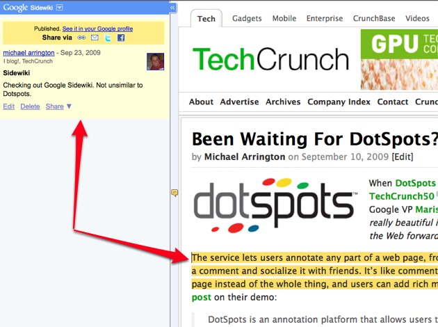 Besides the sites I listed above, TechCrunch50 startup DotSpots, which launched publicly last week, is very similar to Sidewiki. Its no surpise, then, that Google VP Marissa Mayer liked Dotspots so much when it first demo’d in 2008: “It’s a really beautiful idea and I really like anything that pushes the web forward in that way.”