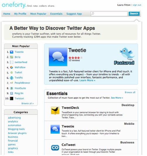 Oneforty’s revenue model is fairly basic. If you want to download Tweetie’s iPhone app, oneforty provides an link directly to Apple’s App Store, allowing oneforty to collect an affiliate fee. Of course for the free downloads and sites, such as TwitPic or TweetDeck, oneforty will just direct you to their sites, where you can download or access the application. oneforty is also going to list Twitter-related books and merchandise, with affiliate links to Amazon.co. An interesting bit of trivia—the site’s founder, Laura Filton, wrote the “Twitter for Dummies” book and taught a “”Twitter for Business” class at Harvard Business School. Oneforty was incubated at TechStars and is advised by Guy Kawasaki and Brian Solis.
