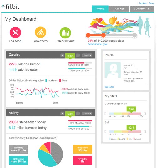 The dashboard is fairly simple and organized. You input your age, height, weight, and gender and are given basic info of how many steps you’ve made in a day and a breakdown of how active you are within the day, showing the highs and lows of your activity. The site will even break down particular activities and measure the intensity of workout. In terms of caloric burn and intake, Fitbit will calculate how many calories you burn in a given day, and if you log in your nutritional info, will also compare that to how much your intake was, making it ideal for anyone who wants to lose weight. And Fitbit has made it easy to input any type of food by already integrating the nutritional value of most types of food, cuisine and even restaurant chain foods, which cuts out a large amount of work for you.