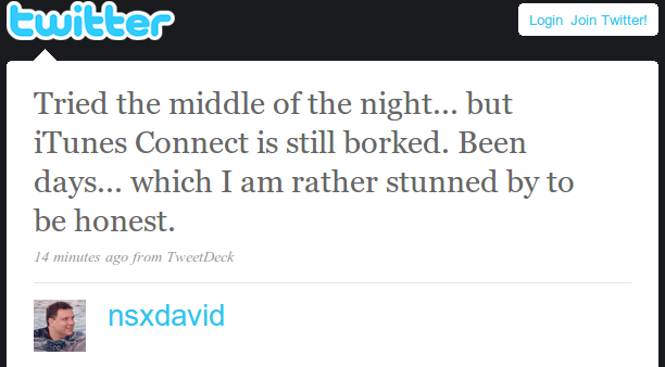 We’ve been getting a number of tips about iTunes Connect being down for the past couple of days. Looking into it a little deeper, it appears these are not isolated issues, and that app developers all over the world have been experiencing failing or extremely slow iTunes Connect linkups for at least the past 48 hours. [Update below]