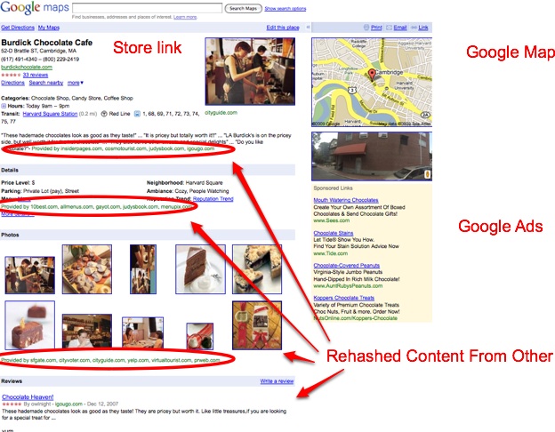 Your chances of clicking on a Google page for this particular search are pretty high. Google isn’t sending you away anywhere. And if you do go to the Google Places page for Burdick Chocolate, it is made up of rehashed content from other sites: snippet descriptions from InsiderPages, Judy’s Book, a menu link from AllMenus, photos from CityGuide and Yelp, and reviews from Igougo and CitySearch. On the right is a small Google Map and below that are Google search ads.
