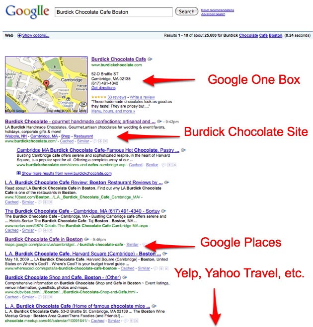 And Google is indexing them, despite assurances to the contrary. If you do a search for the Burdick Chocolate Cafe in Boston, for instance, the Google Places page is the sixth result, above results from Yelp, Yahoo Travel, and New York Times Travel. This wouldn’t be so bad if Google wasn’t already linking to itself in the top “one Box” result, which shows a detail from Google Maps. So within the top ten results, two of them link back to Google content.