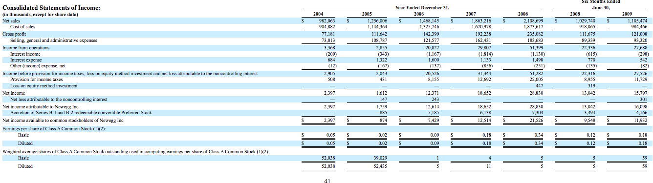 Newegg’s net income increased 55 percent in 2008, to $28.4 million. Sales increased 13 percent to $2.1 billion in 2008, and have just more than doubled since 2004, when sales were $982 million. As a retailer, NewEgg’s’s profit margins are slim. It was only 1.4% in 2008. Amazon’s profit margins are around 3.3%, which is double Newegg’s margins. Reaching a 3.3% margin may the best Newegg can hope for. And while Newegg is seeing decent revenue growth, retail is tough, especially when your biggest competition is Amazon.