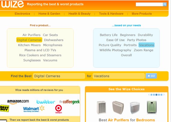 Wize’s technology has been tweaked to read reviews across the web and then analyze what people have said is good, bad or important using real everyday language (i.e. Very Portable, Great for sports!). So shoppers can indicate in their product review search that they are looking for a camera that is “very portable” or “good for vacations” and they will receive recommendations with that language.