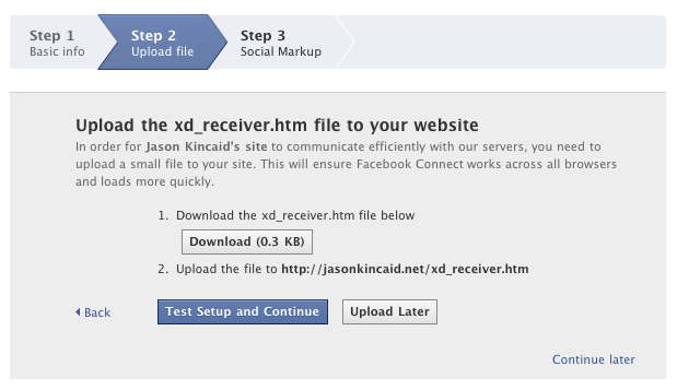 Facebook writes that “you can now incorporate Facebook Connect into your site in 3 easy steps.” The process is simple. First, you enter the name of your site and its URL. Then Facebook asks you to download and then upload a special file to your site’s main directory. And.. that’s about it. Once you’ve done that, Facebook will present you with its Playground — a list of code snippets you can embed on your site to round out the functionality, including Login buttons, profile photos, publishing items to News Feeds, and rendering photos of a user’s friends.