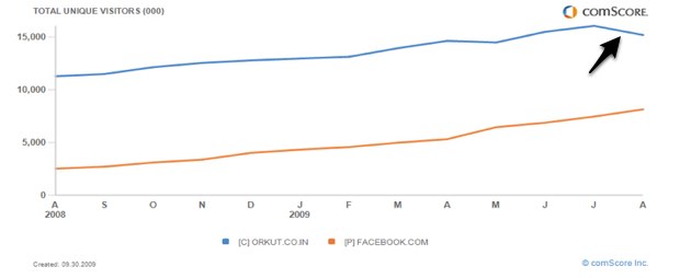 This the largest drop in unique visitors Orkut has seen in India over the past year, while Facebook has been steadily growing each month. In fact, Facebook’s audience in India is up 228 percent from a year ago, compared to a 35 percent annual gain for Orkut.
