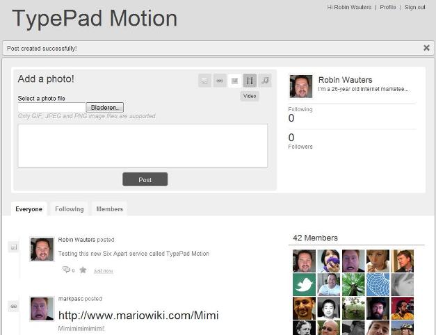 The service is already live here, so I played around with it a little and found that it was far from anything remotely spectacular in terms of functionality or wealth of features. You log on with your Typepad account and add text (no character limit, links, photos, online videos and audio) to your Motion profile. Other community members can subscribe to your new blog and comment much like any other microblogging / lifestreaming service. That’s about it, although the open-source aspect is interesting for the future.
