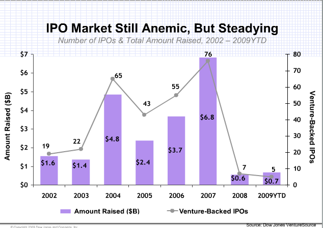 Despite a couple large IPOs (LogMein and A123Systems) and a steady but tempered flow of mergers and acquisitions, financial exits for venture-backed companies remained anemic in the third quarter of 2009. Data released by both Dow Jones VentureSource and the National Venture Capital Association/Thomson Reuters show declines in both M&A and IPO dollars. VentureSource counts $2.9 billion in combined M&A exits in the third quarter, 49 percent lower than a year ago. The NCVA tallies up a $1.8 billion total, which is down 46 percent.