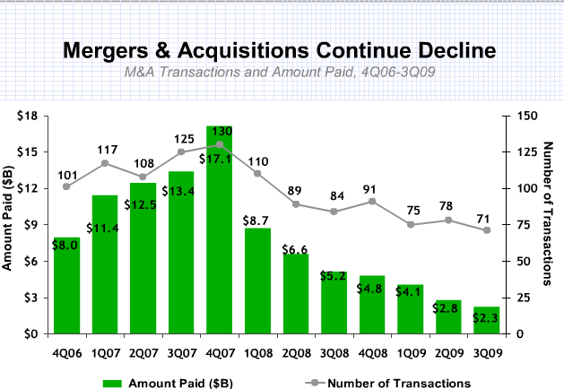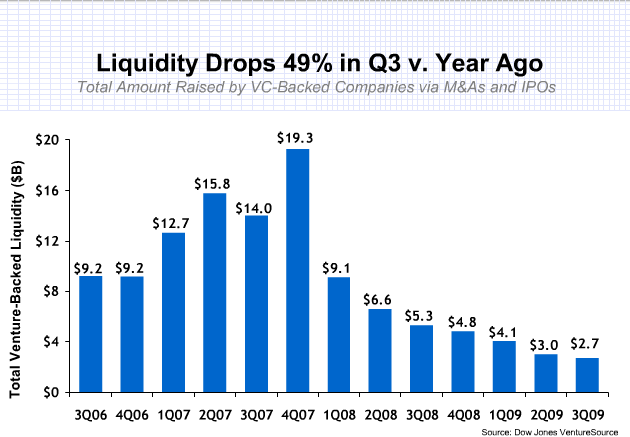 The M&A picture wasn’t much brighter in the quarter. VentureSource tracked 71 deals worth $2.3 billion, down from $5.2 billion last year and $2.8 billion in the second quarter of this year. Some of the larger deals during the quarter were VMWare buying SpringSource for $362 million and Intuit buying Mint for $170 million. (Remember, these are only venture-backed exits. Deals for publicly traded companies like Adobe buying Omniture for $1.8 billion, Dell buying Perot Systems for $3.9 billion, or Xerox buying Affiliated Computer Services for $5.75 billion are not counted in these numbers).